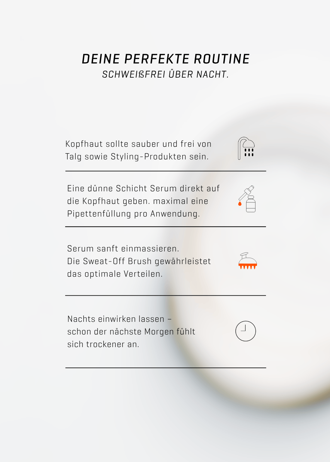 Das Sweat-Off Serum stoppt Schwitzen am Kopf gezielt und langfristig. Die einzigartige Formel basiert auf Aluminiumchlorid – dem effektivsten, nicht-invasiven Wirkstoff der Dermatologie gegen Schwitzen. Ergänzt wird diese hohe Wirksamkeit durch zwei bewährte Inhaltsstoffe der Kopfhautpflege: Provitamin B5 (Panthenol) bietet Extra-Pflege und langfristig mehr Feuchtigkeit für die Haut, während Biotin die natürliche Schönheit der Haare bewahrt.